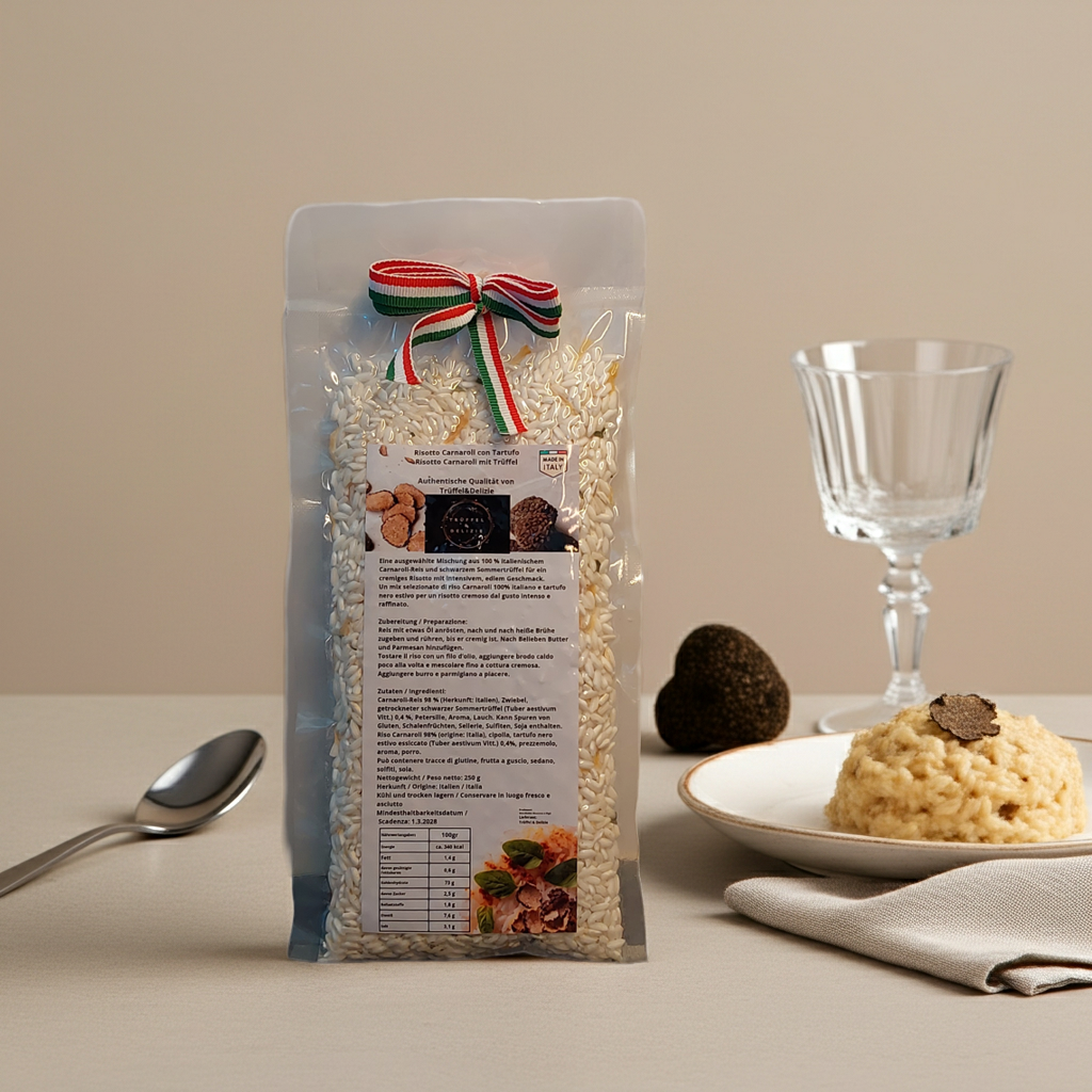 Genießen Sie die Raffinesse unseres Trüffelrisottos, inspiriert von traditioneller italienischer Küche. Hergestellt mit feinstem Carnaroli-Reis, erlesenem italienischem Sommertrüffel (Tuber aestivum) und aromatischer Zwiebel – für ein cremiges, unvergleichlich delikates Geschmackserlebnis.