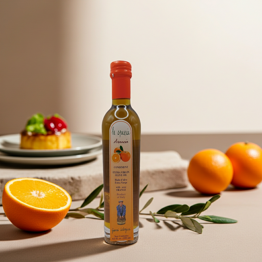 Entdecken Sie die harmonische Süße und das fruchtige Aroma sonnengereifter Orangen. Dieses feine Olivenöl veredelt Desserts, Salate und delikate Gerichte auf besondere Weise. Verwenden Sie es zu Feldsalat mit Nüssen, zu Ziegenkäse oder sogar zu exotischen Desserts – es bringt eine subtile, fruchtige Eleganz auf Ihren Teller.