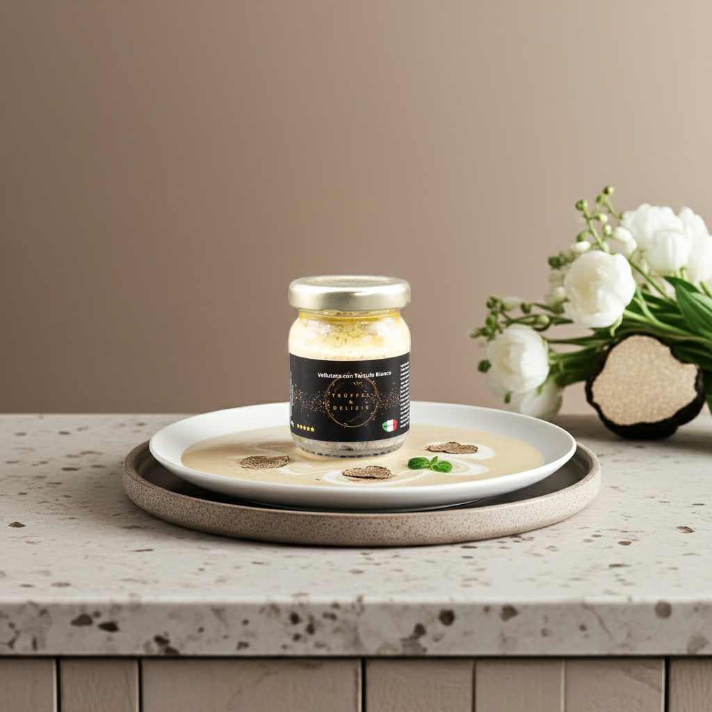 Vellutata mit weißem Trüffel, eine cremige und umhüllende Sauce, die die samtige Textur mit dem intensiven Aroma des weißen Trüffels vereint und jedes Gericht in ein Gourmet-Erlebnis verwandelt; ideal, um Pasta, Risottos und Fleischgerichte zu verfeinern, aber auch perfekt, um einfache Bruschetta zu bereichern oder als Dip für frisches Brot zu dienen. Diese Vellutata wird aus hochwertigen Zutaten ohne künstliche Zusatzstoffe hergestellt und garantiert einen authentischen und raffinierten Geschmack, der Ihre Sinne und die Ihrer Gäste verzaubern wird, sodass jeder Anlass besonders und unvergesslich wird.